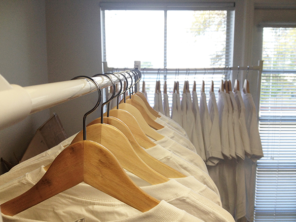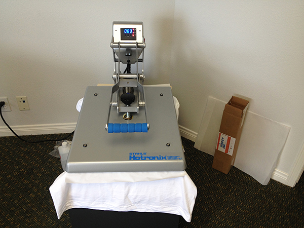 First, we had to prep all the shirts for the order which included pressing them, spraying them with pre-treatment, curing the pre-treatment with the heat press, and hanging them to finish drying.