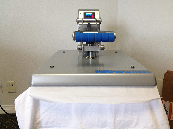 Once the printing is complete the shirt goes back into the heat press one last time to cure the design and set the ink. The sheet on top of the shirt has a silicone coating so the ink doesn’t transfer to the pressing plate.