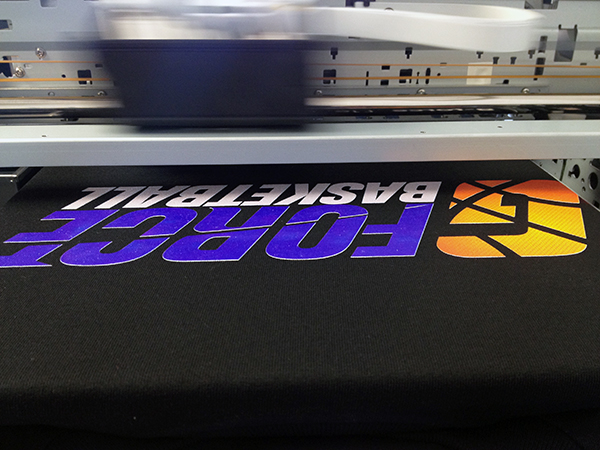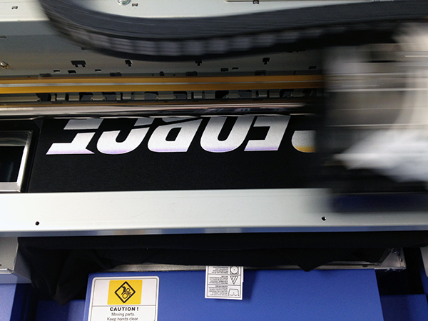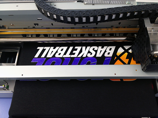 The DTG lays down the white layer and then impressively (and precisely) sprays the gradient effect colors over top.