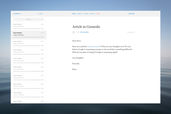 Focusing on the main reasons we use email, 1910 Design & Communication have created an amazing alternative to the standard looking email boxes of today. Focusing on being readability over flashy design they created a very simple and beautiful way to view email.
