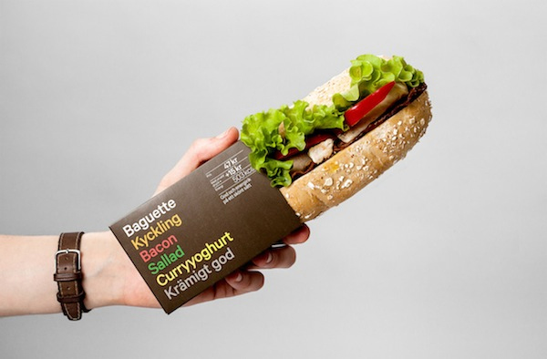 Swedish agency BVD has created a very clever style of packaging for sandwiches. Instead of reading through the ingredient list or taking a wild guess every thing between the bread is displayed in great type and is color coordinated to the ingredient it self.